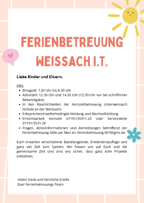 Alle weiteren Informationen zur Ferienbetreuung finden Sie auf der Seite des Anmeldelinks.