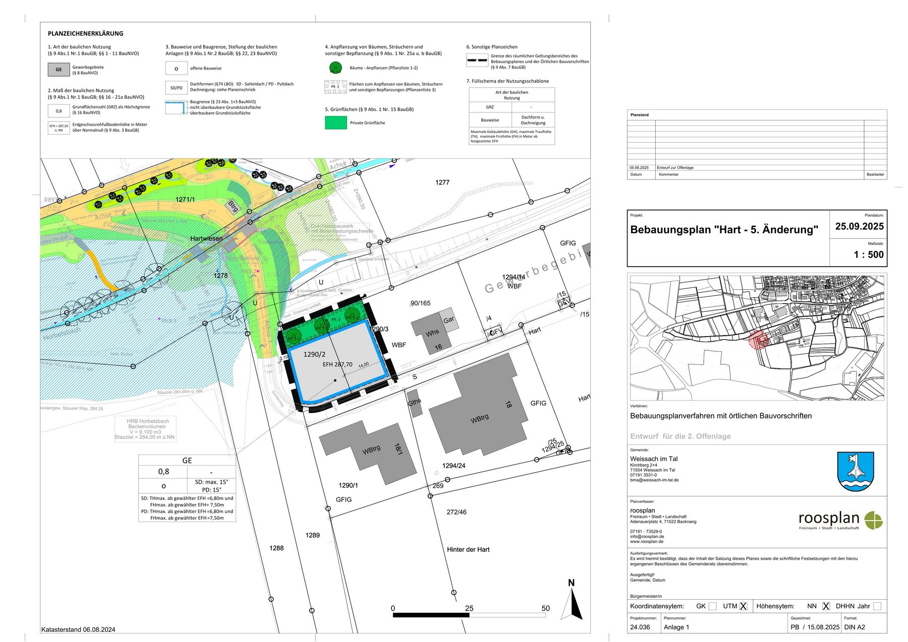 Der Gemeinderat der Gemeinde Weissach im Tal hat am 25.09.2025 in öffentlicher Sitzung beschlossen, den Bebauungsplan und die örtlichen Bauvorschriften „Hart 5. Änderung“ gemäß § 4a Abs. 3 BauGB erneut öffentlich auszulegen.